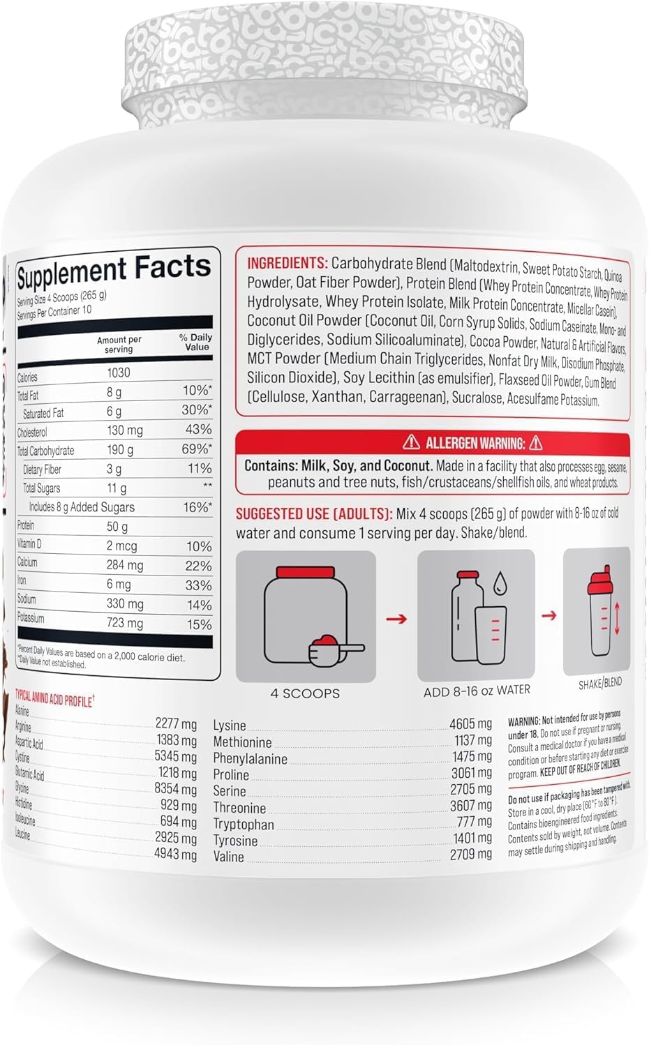Mix 1–2 scoops of Basic Supplements Muscle Mass Gainer with water or milk and consume after your workout or between meals. For best results, take it consistently along with a balanced diet and strength training program.